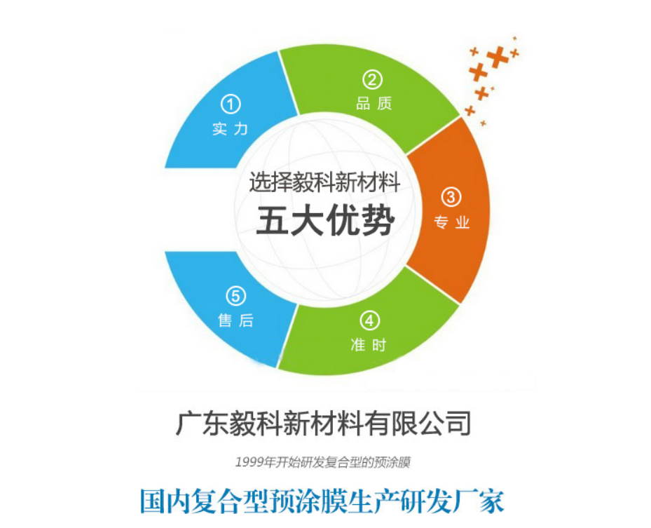 广东毅科新材料有限公司从1999年开始研发复合型的预涂膜,也是国内复合型预涂膜生产研发厂家,十几年来我们不断努力改进产品,优化产品性能,制造多元化复合材料产品。公司主营产品BOPP预涂膜、PET预涂膜、数码印刷预涂膜 ,广告喷绘热裱膜,PET地暖复合材料,产品应用于包装印刷覆膜、办公用品覆膜,广告热裱覆膜、建筑复合材料、光学复合材料等领域 。公司已通过ISO09001:2008质量管理体系认证、绿色印刷环保标志认证、国家高新技术企业认定;EVA型预涂膜行业标准制定单位等荣誉,先进的ERP系统管理,注重知识产权的开发和应用,授权实用新型专利有多项,申请发明专利多项;还拥有一支优秀的研发团队,专业知识和技术经验丰富,能为产品的质量提供强而有力的技术支撑。有良好的企业氛围和浓厚的「B体育」,我司运用5S的管理营造一目了然的工作环境,养成良好的工作习惯,提升员工水平,一起营造一个和谐美好的工作环境,从而达到规范化管理。 感恩,价值,共进,分享是我们的理念,“双赢”是我们的经营方针,我们将进一步完善企业质量管理体制,为客户提供更优质的产品和服务。