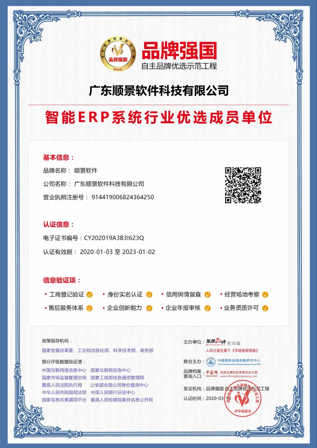 经由品牌强国示范工程东莞地区运营中心审核、认证、社会公示,“顺景软件”符合示范工程评选标准,成功入选为品牌强国示范工程智能ERP系统行业优选成员单位,企业信息录入品牌强国示范工程数据库,在国家级平台展示品牌形象。